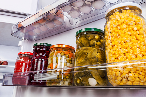 7) Zrak v hladilniku kroži tako kot v prostoru (v smeri urnega kazalca), kar vpliva na temperaturo v posameznem delu hladilnika. Zato prilagodimo razporeditev živil: vložena, kuhana zelenjava, odprte marmelade na zgornji polici (kjer je najbolj hladno), mlečni izdelki na srednji polici, pijača, omake, jajca na vratih, zelenjava, sadje v spodnjih predalih.