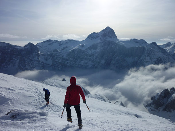 5. Previdno pri hoji: Hoja po snegu je predvsem naporna in običajno zahteva več časa. Ne zaupajte slepo gazi, ki je pred vami, temveč sami spremljajte, ali se gibljete po varnem področju. Hoja po zaledenelih površinah pa zahteva predvsem previdnost. Upoštevajte tudi, da lahko na grebenih veter ustvarja snežne opasti, ki se lahko pod našo težo podrejo, zato hodite nekaj metrov pod grebenom na privetrni strani.
