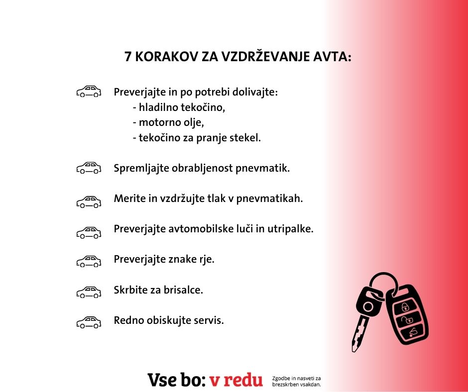 Vozila postajajo vse bolj izpopolnjena in veliko stvari, ki so jih znali opraviti naši očetje sami, danes lahko opravijo le usposobljeni mehaniki. Vseeno pa je nekaj stvari, za katere je dobro, da jih zna preveriti vsak voznik. Tehnični tipi boste to seveda znali brez navodil in nasvetov, za vse ostale pa v članku po sklopih predstavljamo najbolj osnove korake za vzdrževanja avta. Posebno pozornost avtu namenite tudi pred daljšo potjo ali dopustom, pred zimo ali pred prodajo vozila.