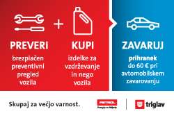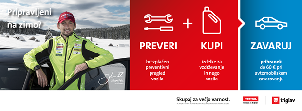 Če pa se boste odločili še za nakup izbranih izdelkov na bencinskih servisih Petrol, kot so hladilne tekočine, sredstva za nego avtomobila, zimske pnevmatike, svetlobna telesa, motorna olja, brisalci in avtomobilski akumulatorji, pa se popust še poveča. Višina ugodnosti za novo sklenjena zavarovanja bo v kombinaciji pregleda in nakupa izdelkov lahko največ 60 evrov, pri obnovi zavarovanja pa največ 30 evrov. Popust v tej akciji lahko izkoristite vse do konca leta (31. 12. 2014).