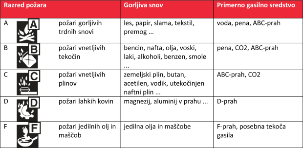 V preglednici je prikazano, katera gasilna sredstva so primerna za posamezne razrede požarov: