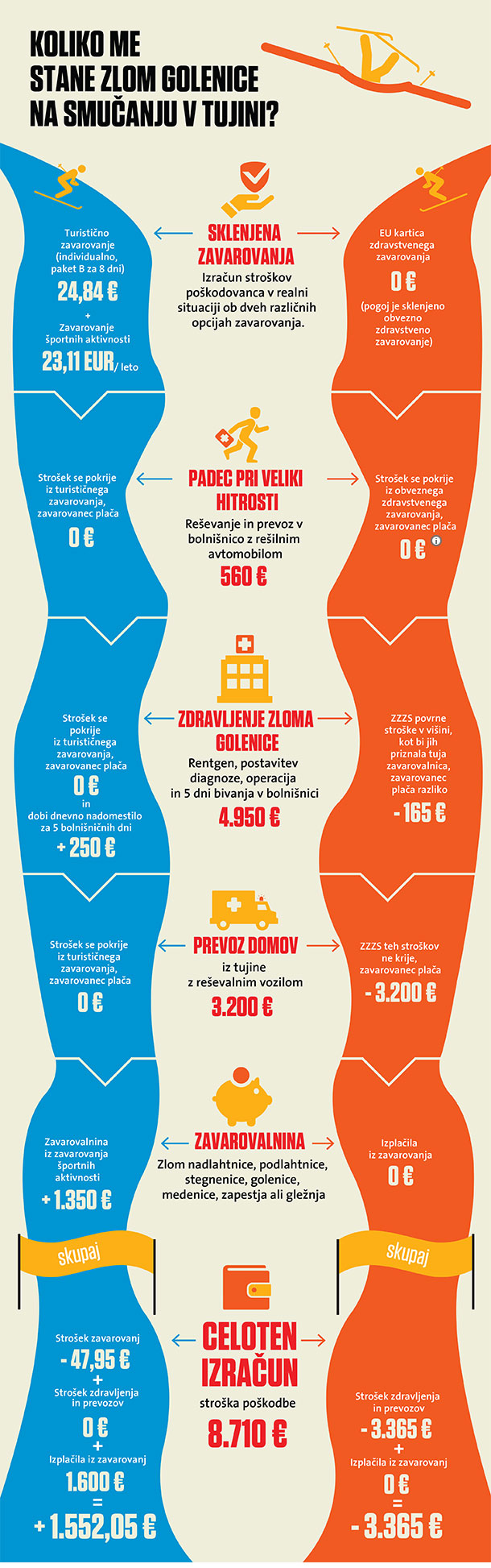 Sončen zimski dan, že peti v tednu, je bil kot nalašč za smuko na enem od priljubljenih alpskih smučišč. A kmalu se je sprevrgel v nočno moro. Izguba nadzora nad smučmi in padec pri veliki hitrosti. Ob začetnem šoku le jeza zaradi zlomljenih palic, nato ob pogledu na nogo spoznanje, da je nekaj hudo narobe. Mrzel pot in huda bolečina. Prihod reševalcev, prevoz v bolnišnico, diagnoza: zlom golenice. Nujna operacija, okrevanje v bolnišnici in prevoz nazaj domov. Na srečo je bila poškodovanka ustrezno zavarovana in nesreča ni pustila posledic tudi v njeni denarnici.