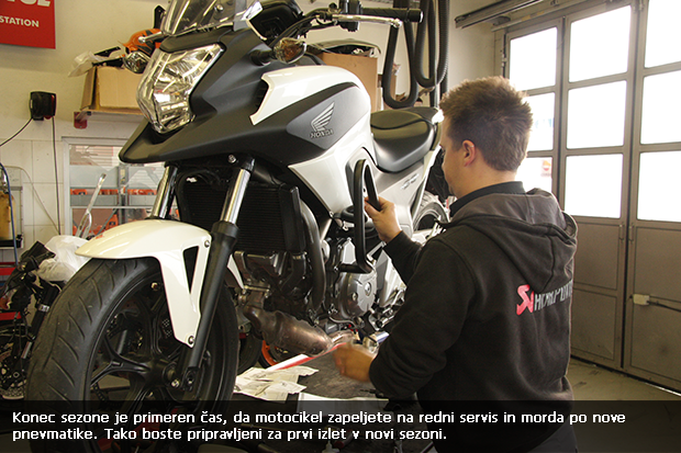 Čeprav so bili topli in suhi jesenski dnevi letos motoristom zelo naklonjeni, se asfalt že ohlaja. V senčnih legah zastaja vlaga, ki v kombinaciji z listjem na cesti lahko hitro privede do zdrsa. Prihaja torej čas, ko bo treba motorju nameniti zimski počitek. Da bo vaš motocikel ob začetku nove sezone pripravljen na nove podvige, mu pred prezimovanjem namenite nekaj več pozornosti. Svetuje Mitja Gustinčič, urednik revije MotoSI.