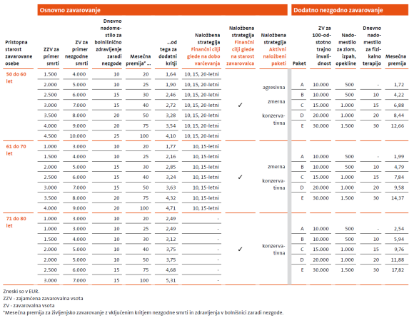 | Način sklenitve zavarovanja | Enostavna izbira med paketi zavarovalnih vsot in premij brez ugotavljanja zdravstvenega stanja | ✔ |